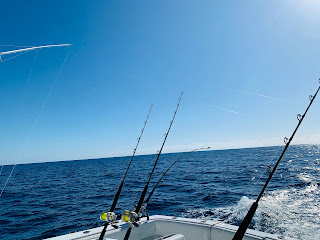 We spent the day trolling with strips of baitfish and spoons on 4 lines; two attached to outriggers, and two with planers that kept the bait deeper that were set up on the stern. We were trying to catch whatever would bite, but specifically were expecting fish like Blackfin Tuna, Wahoo, and Sailfish, as winter is the best time to catch them in Miami. However, there is always the possibility of catching other fish like Mahi Mahi, which are generally better in the summer. While the conditions were nice for us on the boat - the water wasn't even rocky at all - it was a slow day of fishing. When trolling, you drive the boat while pulling bait through the wake in the back of the boat. Because of this, we spent most of the time playing the waiting game. We were not the only ones not catching fish, either; there were lots of boats on the water that morning, but nobody was reporting any catches on the radio. Captain Peter's spots are, like most charter captains, tested by time. With the time we had this morning, we were going to drive north in zig zags over ledges; fish are often found under them, waiting for unwitting baitfish to swim over them while they hide next to the ledge. We spent the day doing this, but found no luck. We were marking fish on the radar, but they just were not biting.
