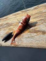 The first thing Jakes and I did when we got back to Los Angeles for the summer was plan out a fishing trip with Dod Shlome. After looking around at different fish counts around southern California ports and available boats, we decided to go with a 3/4 day trip on the Spitfire out of Marina Del Rey. We woke up early and drove over to the dock before sunrise, eager to head out for what seemed like was about to be a really fun day on the water. We rented our gear and boarded the boat soon after first light. The skies were very clear. As normal on these boats, it was colder and windier towards the beginning of the day on the way out before heating up as it got deeper into the morning. We saw multiple Ocean Sunfish near the surface of the water as we made our way west to the first spot, which ended up being off the shore of Malibu. This time, we were able to use live squid, a bait supplied on the boat that I do not recall trying before. Jakes and Dod Shlome were the first to hook up, reeling in some rockfish. That would set the tone for most of the rest of the day, as we would double up on fish at times and reel in fish after fish. Most of the rockfish we would catch would be Salmon Grouper or Vermillion Rockfish. The Vermillion Rockfish were so abundant, in fact, that after a few hours of catching them the captain moved us to a different spot since everyone had caught their limits of the fish. One distinct species of rockfish we caught was the Halfbanded Rockfish. Although small, its black bands and white spots contrasted by a red body makes it distinct. The next spot was not as productive for us, with Dod Shlome catching the only fish there between the three of us. However, it was a species I hadn't seen in a while: a California Sculpin - a different, very interesting red colored rockfish with poisonous spikes on its back. Next to me, a fisherman using the same bait as me (live squid drifting on the bottom) caught a solid Pacific Halibut, which you could differentiate from flounder because of their diamond-like, more pointed fin/body shape. We made our way back at around 2:30 after a nice morning of fishing and full bags. By the end, we had about 12 fish total, 6 of which were caught by me. The drive back in was beautiful, with perfect, sunny weather and views of Hollywood, Santa Monica, Downtown LA, the Santa Monica Mountains, and more areas of LA that I go to often but have never seen from such an angle. We went home and started cooking fish tacos, as we had all anticipated since we booked the trip. It was all around a great day of keeping the annual tradition on the water alive with Dod Shlome.